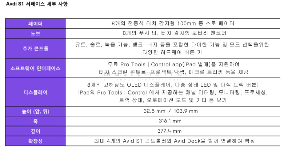 Avid S1 Control Surface는 음악 프로덕션, 방송, 포스트 프로덕션을 위한 고급 컨트롤 서페이스로, Avid의 Pro Tools, Media Composer, Logic Pro, Cubase, Nuendo, Ableton Live 등의 DAW(디지털 오디오 워크스테이션)와 연동됩니다.