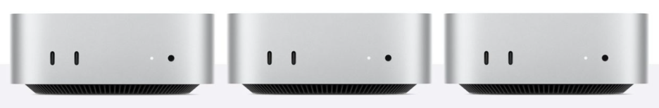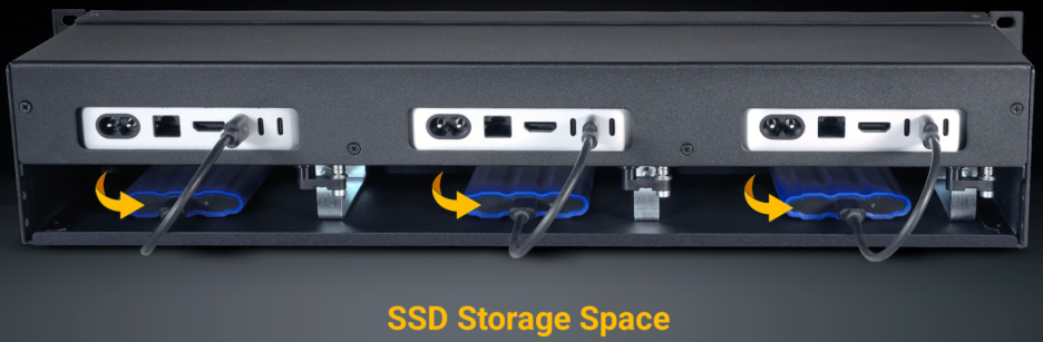 RackMac mini는 각 컴퓨터 아래에 최대 너비 4인치 x 깊이 4인치 x 높이 0.5인치의 USB SSD(별도 판매)를 수용할 수 있는