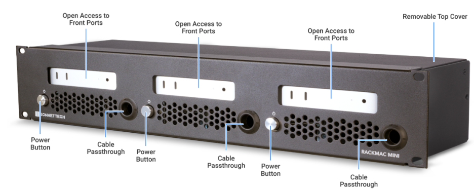 RackMac mini는 3대의 맥미니를 랙에 나란히 고정하고 효율적이고 보호적인 전면 패널 뒤에 배치할 수 있는 견고한 강철